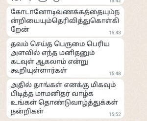 இன்றைய காலகட்டதுல தன்னலமற்ற நேர்மை நிறைந்த மனிதர்களை பார்ப்பது அரிது Since 2019 being ur silent follower Not a single change noticed yet Got Inspired a lot with Ur honest Speech… Thanks and Gratitude வாழ்த்த வயதில்லை வணங்குகிறேன்